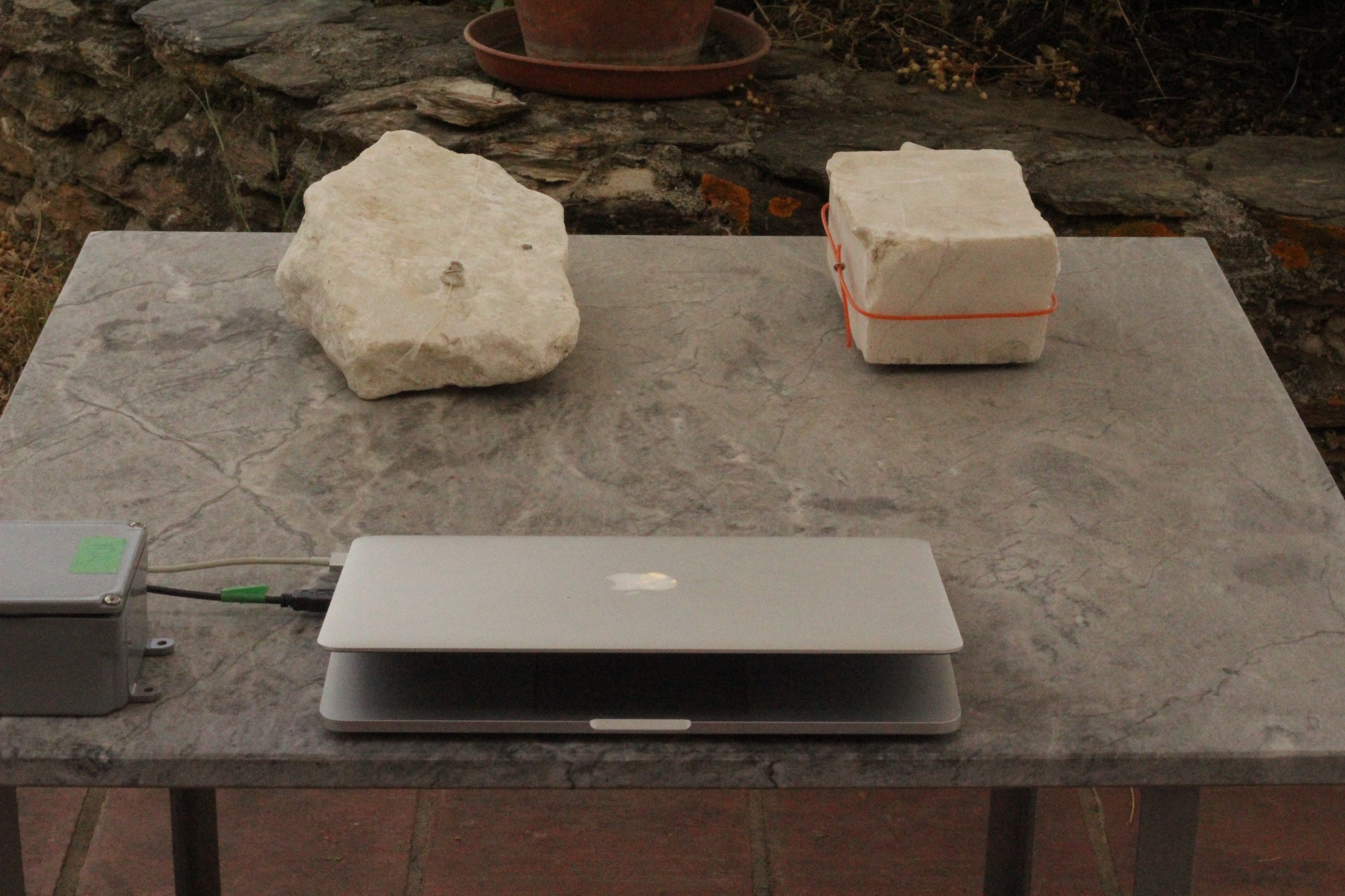 Where Stillness Breaks is an interactive sculpture that explores memories, associations and speculative connections between felt vibration and words. Vibrotactile motors are strapped to rocks from the local region. A chalk coal drawing on the floor gives a chart with which players and visitors can organize vibrations and words. “You are welcome to take a piece and move it to somewhere else on the chart. If you place it where there is already another word, please strike through that word and add one you think fits better.” Some take the marble to a corner to explore associations in private while others share, discuss and find words through collaboration.
